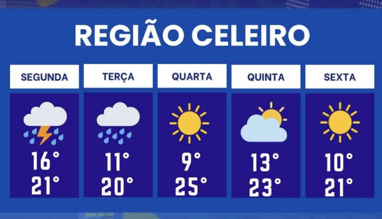 A semana começou com instabilidade climática na região Celeiro. Para esta segunda-feira (8), a previsão indicou volume de aproximadamente 30 milímetros de chuva, com temperaturas variando entre 16°C e 22°C.