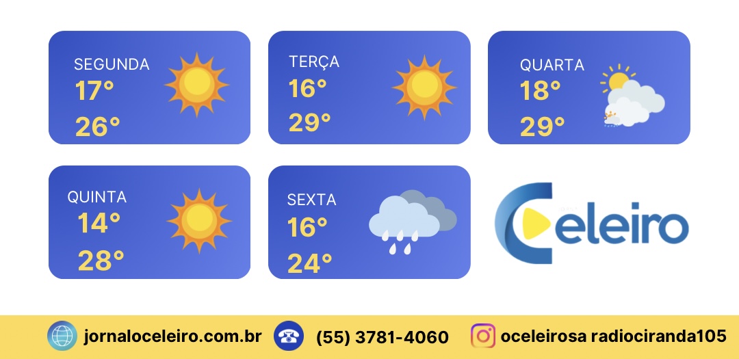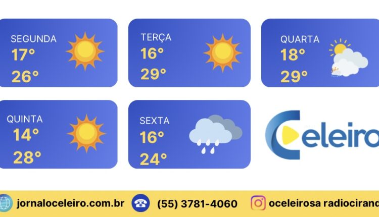 A previsão do tempo indica que a Região Celeiro terá predomínio de sol e temperaturas agradáveis até a quinta-feira. Os dias começam com clima ameno e aquecem no período da tarde. Na segunda-feira, as temperaturas devem variar entre 17°C e 26°C; na terça, entre 16°C e 27°C; na quarta, entre 18°C e 29°C; e na quinta, entre 14°C e 29°C. A mudança ocorre na sexta-feira, quando há possibilidade de chuva, com mínima de 16°C e máxima de 24°C.
