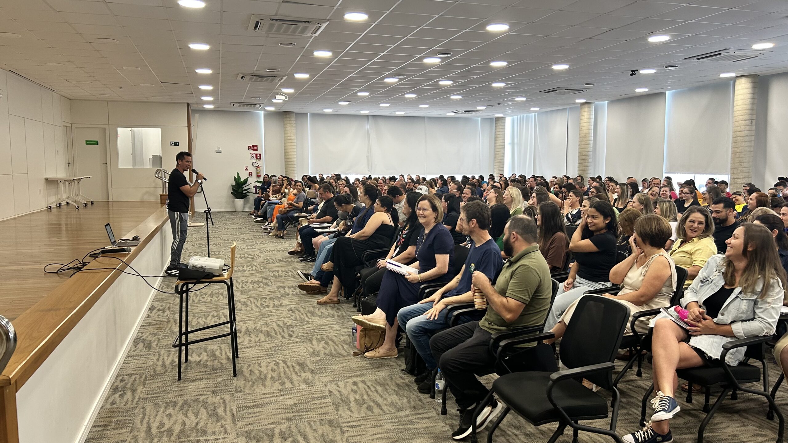 Com o tema “Entusiasmo na volta às aulas: a escola que encanta e promove aprendizagem”, a palestra foi ministrada por Márcio Bernardes, profissional da área educacional, natural de Santos, no litoral paulista.