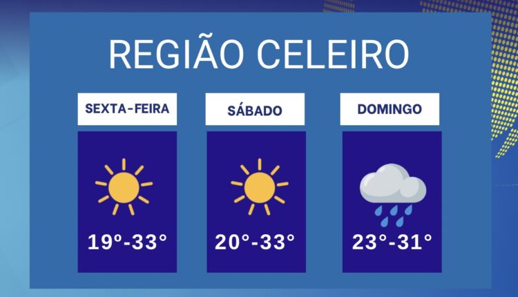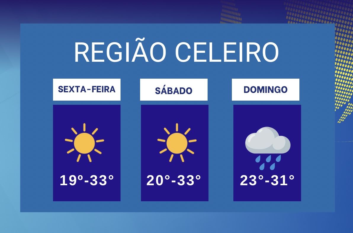 Nesta sexta-feira, o tempo permanece ensolarado, com temperaturas variando entre 19°C de mínima e 33°C de máxima. No sábado, o cenário se repete, com sol predominando e termômetros marcando mínima de 20°C e máxima de 33°C.