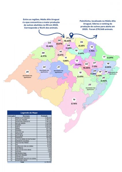 No ranking estadual de 2025, Palmitinho assumiu a liderança, com 278.568 suínos destinados ao abate, superando Rodeio Bonito, que aparece na segunda posição com 246.291 cabeças. Na sequência estão Nova Candelária (233.976), Aratiba (231.390) e Pinheirinho do Vale (225.503).