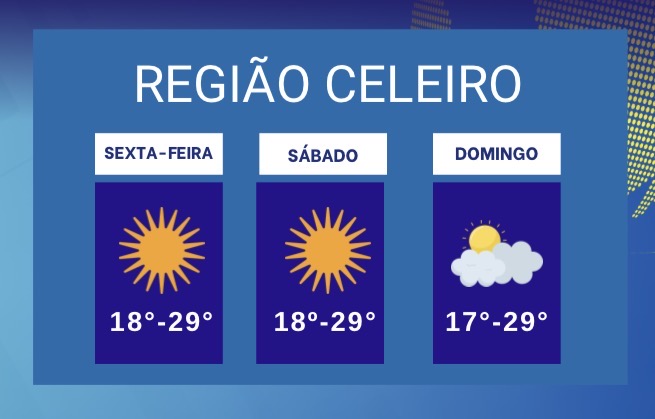O sábado mantém o mesmo padrão, com sol entre nuvens e clima estável. As temperaturas seguem semelhantes, com mínima prevista de 18 graus e máxima de 29 graus.