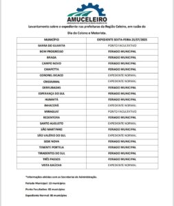 Segundo levantamento realizado pela Amuceleiro, dos 21 municípios da região, em 13 será feriado municipal, em seis será expediente normal e dois será ponto facultativo.