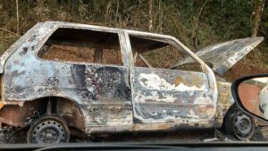 No final da tarde desta segunda-feira (28), um veículo Fiat Uno foi encontrado completamente consumido pelas chamas na estrada que liga os municípios de Campo Novo e Coronel Bicaco.