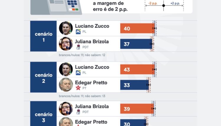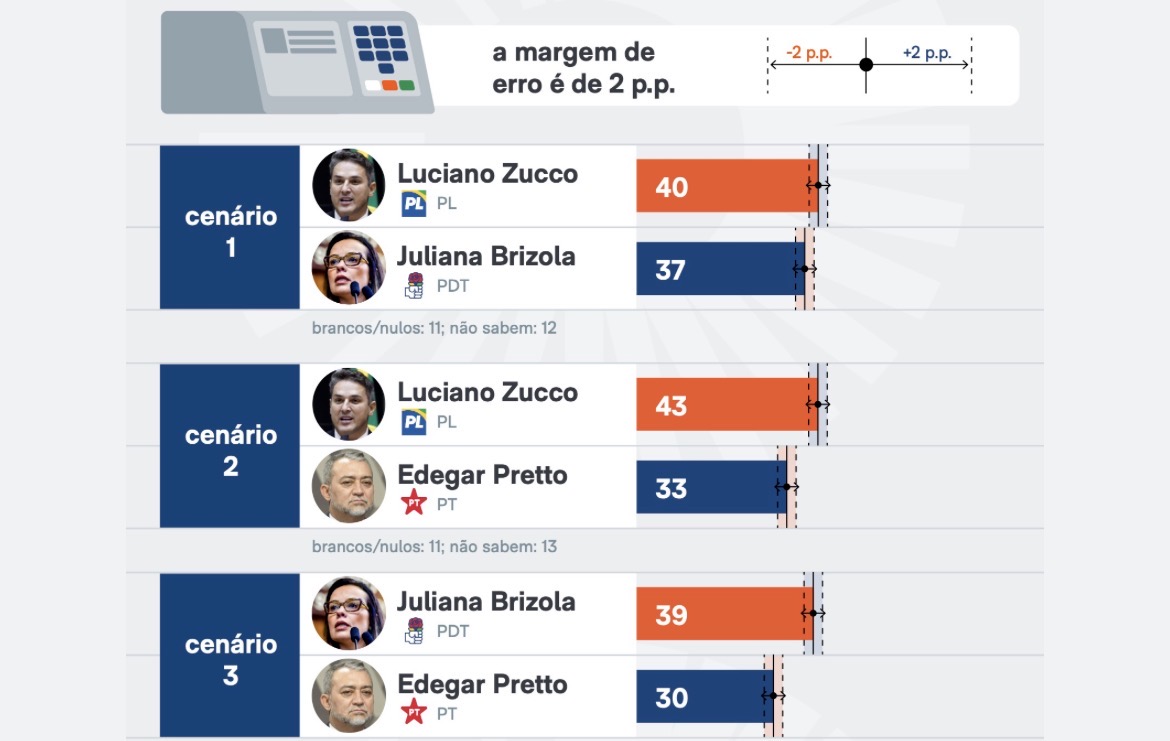 Em outro cenário estimulado, Zucco registra 35% contra 30% de Juliana Brizola. Quando o nome da pedetista não é incluído, Zucco amplia a vantagem, chegando a 36%, enquanto Edegar Pretto aparece com 27%.