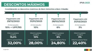 Para quem pretende aproveitar os descontos máximos do IPVA 2023, que podem chegar até 32%, têm até esta quinta-feira, 29 de dezembro, para quitar o imposto. Quem o fizer, terá um abatimento de 10% e não incorrerá na variação da UPF/RS (que pelos índices inflacionários também deve ficar em 5,76%), gerando uma redução potencial de 15,76%¨.