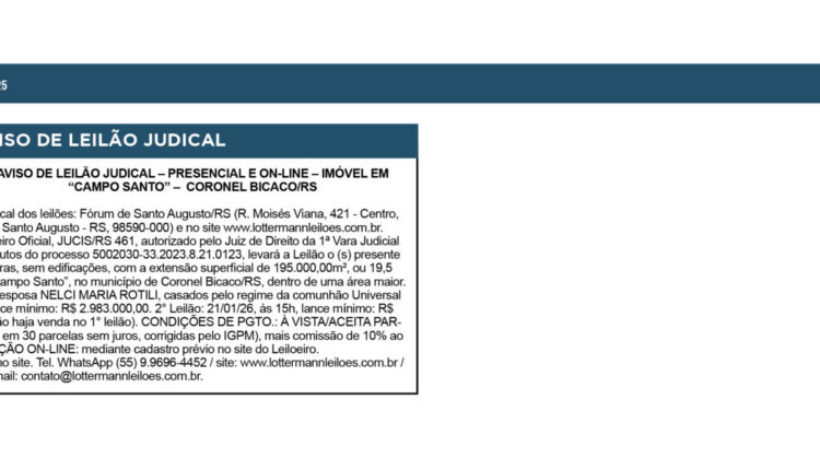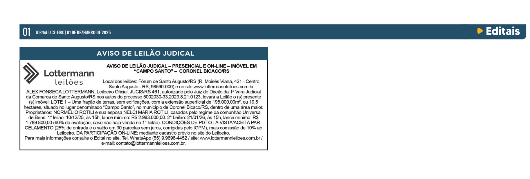 Publicações legais de 01 de dezembro de 2025 Publicações Legais By Redação - Jornal O Celeiro On dez 1, 2025 Share Download Share