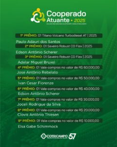 A nona edição da ExpoAgro foi finalizada com o sorteio da campanha promocional Cooperado Atuante 2025 Cotricampo, que teve a participação de mais de 66 mil cupons, com nove prêmios distribuídos: uma camionete Fiat Titano Volcano, duas camionetes Volkswagen Saveiro Robust e seis vale-compras: de 10, 20, 30, 40, 50 e 60 mil reais