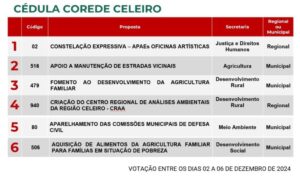 Os eleitores poderão escolher três propostas entre as seis apresentadas. Elas foram definidas, a partir de discussões promovidas pelos Conselhos Regionais de Desenvolvimento (Coredes) de cada região do Estado. As três propostas que receberem mais votos, serão eleitas e vão receber os recursos financeiros.