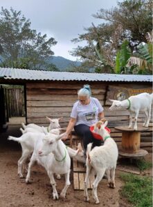 “Eu me apaixonei pela raça Saanem há três anos, fui estudar, entender como criar, é a maior cabra de leite do mundo e hoje já tenho cinco exemplares da raça Saanem, dando cria, e outras cinco mini-cabras também”, destaca a engenheira aposentada de 65 anos Bernadete Batista, de Governador Celso Ramos, em Santa Catarina. As cabras são tratadas com todo o cuidado, tem até música clássica e parquinho de brinquedos, conta a criadora. O capril BBBAmbiental conta com a orientação da Empresa de Pesquisa Agropecuária e Extensão Rural de Santa Catarina, a Epagri.