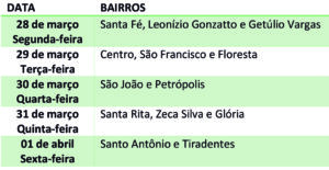 Durante a coletiva de imprensa realizada na manhã dessa sexta-feira, 25 de março, a Secretaria Municipal de Saúde divulgou um cronograma de limpeza que deverá ocorrer nos Bairros de Santo Augusto.