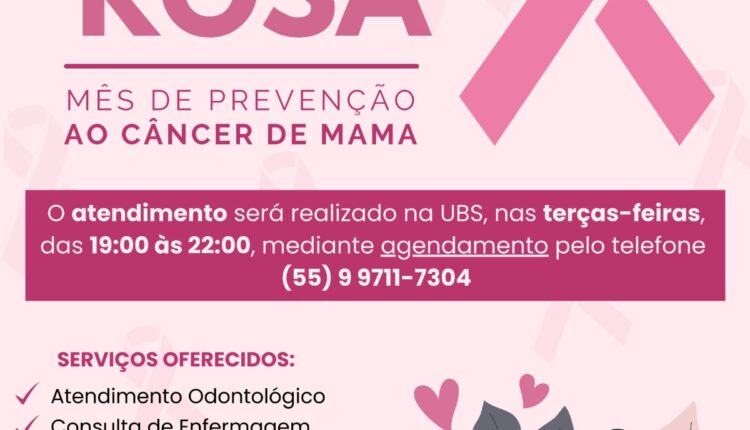 A programação iniciou com o atendimento noturno para o público feminino na Unidade Básica de Saúde, que será realizado todas as terças-feiras do mês de outubro, das 19:00 às 22:00, mediante agendamento prévio pelo telefone da UBS. No atendimento noturno, estão sendo oferecidos atendimento odontológico, realização de exame preventivo e testes rápidos, e encaminhamento para mamografia.