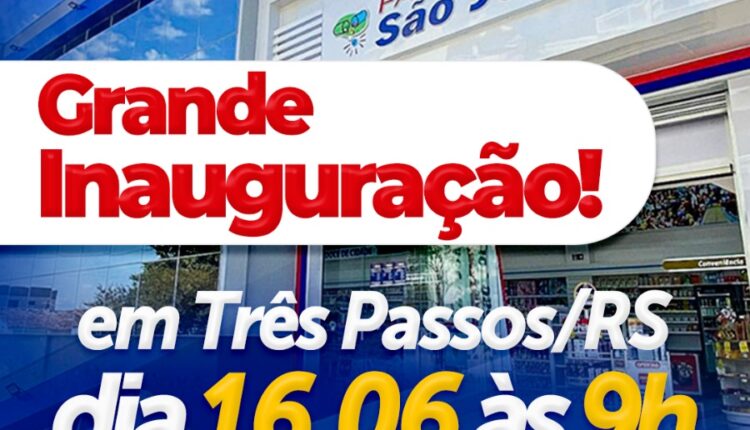 Nesta segunda-feira (16), ocorre em Três Passos, a inauguração de mais uma filial das Farmácias São João. A nova unidade está localizada na Avenida Júlio de Castilhos, 170, no centro da cidade.